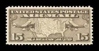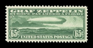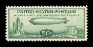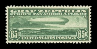 1576 nhu C18 image#C18, 50c Graf Zeppelin, the "perfect" mint example of one of the most popular stamps in United States philately, in fact this is the sole copy in the PSE population report to receive the prestigious grade of Gem 100, the highest grade awarded, as every aspect of this stamp is flawless, with mathematically precise centering amid extraordinarily large margins, strong rich color on pristine white paper, brilliant o.g., n.h., simply superb; 1988 PF certificate and a 2003 PSE certificate (Gem 100; SMQ $400.00 for 98, unpriced in this extraordinary grade). (Image) $100.00