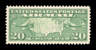 1565 nhu C9 image#C9, 20c Map, striking mint single of this relatively common stamp, in a most uncommon quality, being perfectly centered within enormous margins all around (quite unlike any other we have seen), brilliantly rich color and a sharp impression on clean white paper, o.g., n.h., extremely fine; a superb large-margined gem; 2004 PSE certificate (Superb 98 Jumbo; SMQ $320.00 for 98); the highest grade given to this stamp, being one of just three examples so graded by the PSE. (Image) $13.50