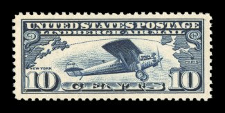 1566 nhu C10 image#C10, 10c Lindbergh, exceedingly well centered within huge margins which are most uncharacteristic of this stamp, strong rich color and impression on fresh white paper, o.g., n.h., extremely fine jumbo; 2006 PSE certificate (XF-Superb 95 Jumbo; SMQ $110.00 for 95 and $310.00 for 98). (Image) $13.00
