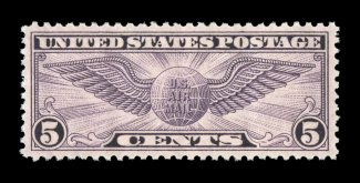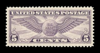 1575 nhu C16 image#C16, 5c Winged Globe, excellent centering within extravagantly large margins which are seldom seen on this rotary press stamp, deep rich color, pristine o.g., n.h., an extremely fine gem; 2005 PSE certificate (XF-Superb 95 Jumbo; SMQ $110.00 for 95 and $270.00 for 98). (Image) $8.75