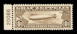 1571 nhu C14 image#C14, $1.30 Graf Zeppelin, a sensational left sheet-margin plate no. 20088 single, in a most remarkable quality, being absolutely perfectly centered within extraordinarily large margins which are rarely seen on this value, rich luxuriant color and a well incised impression, pristine o.g., n.h., extremely fine; a superb gem that is quite comparable to the Killien plate number single, which realized an impressive $8,625.00 (including premium) in our June 2006 auction; 2004 PSE certificate (Superb 98 Jumbo; SMQ $3,650.00 for 98). (Image) $900.00