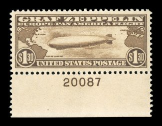 1572 nhu C14 image#C14, $1.30 Graf Zeppelin, an incredibly handsome bottom margin plate no. 20087 single, possessing mathematically perfect centering within very large margins, deep intense color and a prooflike impression, o.g., n.h., extremely fine; a superb gem; 2005 PSE certificate (Superb 98; SMQ $3,650.00). (Image) $900.00