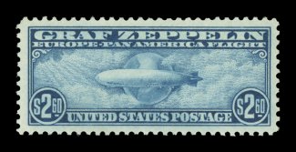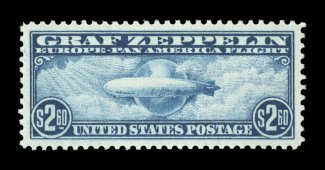 1573 ogu C15 image#C15, $2.60 Graf Zeppelin, a magnificent mint single, being one of only four Graf Zeppelin stamps to grade Gem 100 (two of these are Jumbos), with enormously large and absolutely perfectly balanced margins all around, rich luxuriant color and a deeply etched impression on immaculate white paper, o.g., very lightly hinged, a superb gem; 2006 PSE certificate (Gem 100; SMQ $1,250.00 for 98). (Image) $775.00