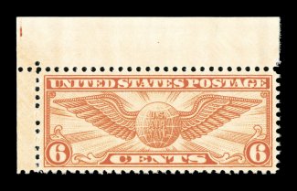 1577 nhu C19 image#C19, 6c Winged Globe, eye-catching top left corner sheet-margin single, wonderfully well centered and margined, brilliant color, o.g., n.h., extremely fine gem; 2006 PSE certificate (XF-Superb 95; SMQ $70.00); while not as impressive a grade as some of the other airmails in this collection, it is the highest grade the PSE has ever given to this stamp. (Image) $3.50