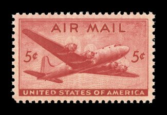 1581 nhu C32 image#C32, 5c Carmine, flawless mint single, absolutely perfect centering amid extravagantly large margins, deep vibrant color and an well incised impression, o.g., n.h., a superb gem; 2006 PSE certificate (Gem 100; SMQ $190.00); this is the only #C32 in the PSE population report to be given the exalted grade of Gem 100, the highest grade recorded. (Image) $0.20