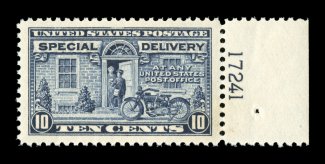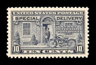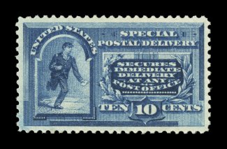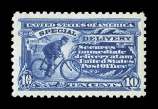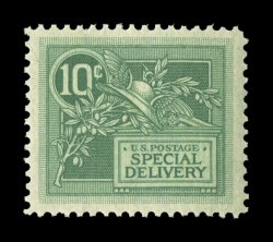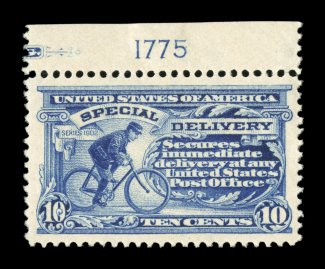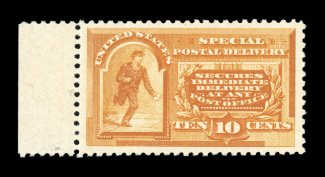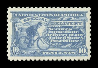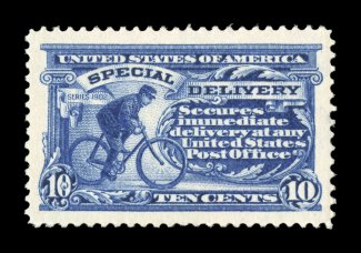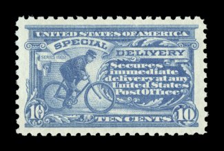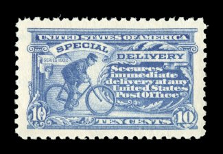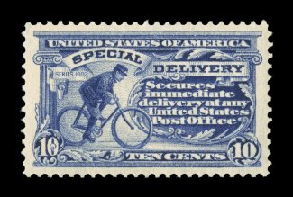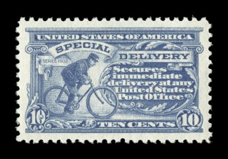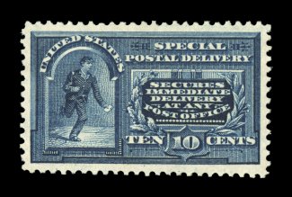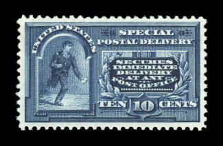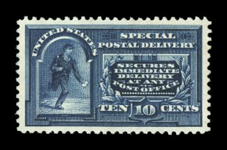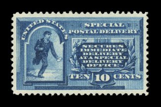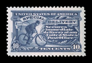 1585 nhu E4 image#E4, 10c Blue, an outstanding mint example of this scarce and challenging special delivery, featuring a remarkable overall freshness and crispness few other stamp possess, with rich luxuriant color and a striking prooflike color on immaculate white paper, plus it is extraordinarily well centered within especially large margins, fresh clean o.g., n.h., an extremely fine gem; a rare stamp in this select never hinged condition; 2004 PSE certificate (XF 90; SMQ $6,450.00). (Image) $2,100.00
