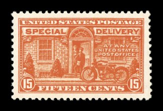 1601 nhu E13 image#E13, 15c Deep orange, a visually stunning mint example, possessing absolutely spectacular color that could not be more intense or vibrant, plus it also features enormous jumbo margins and is perfectly centered within them, pristine o.g., n.h., extremely fine gem; a most remarkable stamp; 1994 and 2001 PF certificates, as well as a 2006 PSE certificate (Superb 98 Jumbo; SMQ $570.00 for 98); the only Scott #E13 to have been awarded this exalted grade, the highest recorded; ex-"Piedmont, Killien". (Image) $55.00