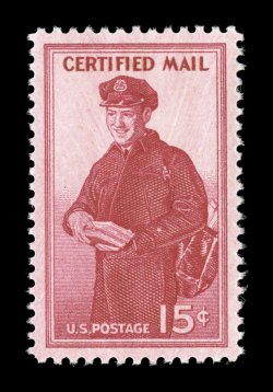 1604 nhu FA1 image#FA1, 15c Certified Mail, lavishly large and perfectly balanced margins all around, brilliantly rich color, immaculate o.g., n.h., a superb gem in the finest possible quality; 2005 PSE certificate (Gem 100; unlisted in SMQ); the only example of this stamp to be awarded this perfect grade. (Image) $0.45