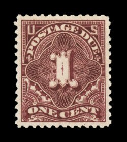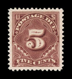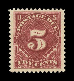 1611 nhu J48 image#J48, 5c Deep claret, a highly desirable mint example, being exceedingly well centered within remarkably wide margins, gorgeous color that is especially deep and vibrant, razor-sharp impression as well, o.g., n.h., extremely fine; 2004 PSE certificate (XF 90 Jumbo; SMQ $690.00 for 90 and $1,100.00 for 95); this is the highest grade given to a never hinged Scott #J48, and the sole example so graded. (Image) $300.00