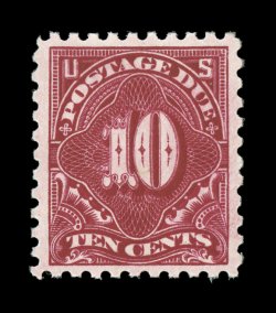 1612 nhu J56 image#J56, 10c Carmine lake, brilliant "post office" fresh mint single, featuring dazzling color that is extraordinarily deep and intense, as well as a truly prooflike impression on crisp white paper, o.g., n.h., an extremely fine gem with outstanding eye appeal; 2006 PSE certificate (XF 90; SMQ $420.00). (Image) $220.00