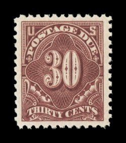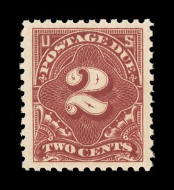 1609 nhu J39 image#J39, 2c Deep claret, an eye-arresting bottom margin plate no. 247 mint single that is in the finest quality available, featuring a marvelous freshness and brilliance few other stamps from this era enjoy, with radiant color and an especially vivid impression on immaculate white paper, but just as striking is its mathematically precise centering within extravagantly large margins, pristine o.g., n.h., a superb gem in every regard; 2005 PSE certificate (Superb 98; SMQ $460.00); the highest grade assigned to any example of Scott #J39. (Image) $40.00