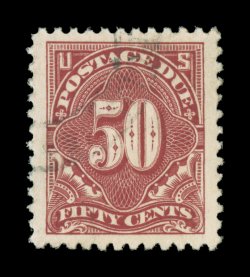 1618 Ou J67 image#J67, 50c Carmine rose, an incomparable used single, possessing huge margins all around and being marvelously well centered within them, bright fresh color, unusually light and unobtrusive cancel, extremely fine; a superb used gem; 2003 PSE certificate (XF-Superb 95 Jumbo; SMQ does not price used); the only #J67, whether mint or used, to be assigned this grade, the highest in the PSE population report. (Image) $1.00