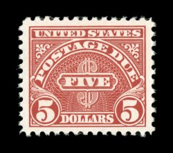 1619 nhu J78a image#J78a, $5.00 Scarlet, exceedingly well centered within very large margins, brilliantly fresh color on pristine white paper, o.g., n.h., extremely fine; 2005 PSE certificate (XF-Superb 95; SMQ $180.00); the highest grade awarded to this stamp to date. (Image) $75.00