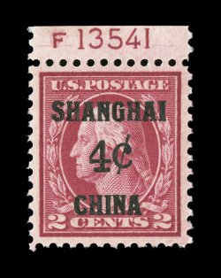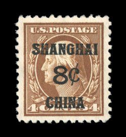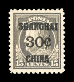 1631 nhu K15 image#K15, $1.00 on 50c Light violet, an incredibly choice mint example of this key Shanghai overprint, possessing several desirable qualities, including being impeccably centered within uncharacteristically large margins, outstanding color that is exceptionally bright and fresh, highly detailed impression on immaculate white paper, pristine o.g., n.h., an extremely fine gem in every regard; a very rare stamp in this outstanding never hinged condition; 2002 and 2005 PSE certificates (latter grading XF-Superb 95; SMQ $6,950.00); the highest grade awarded to #K15 in the PSE population report, being one of only two never hinged examples to achieve XF-Superb 95 status. (Image) $1,300.00