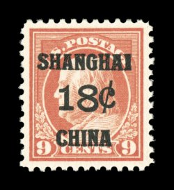 1626 nhu K9 image#K9, 18c on 9c Salmon red, brilliant mint single, gorgeous rich color and impression on especially bright paper, large wonderfully well balanced margins all around, unblemished o.g., n.h., an extremely fine gem; a wonderfully choice stamp; 2006 PSE certificate (XF-Superb 95; SMQ $1,100.00); the highest grade awarded to date for any mint Scott #K9; ex-Killien. (Image) $170.00