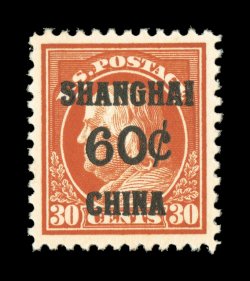 1630 ogu K14 image#K14, 60c on 30c Orange red, a brilliant mint single, possessing eye-arresting radiant color and a striking vivid impression on pristine white paper, exceptionally well centered within uncommonly large margins, o.g., just a faint trace of hinging, extremely fine gem; 2005 PSE certificate (XF-Superb 95; SMQ $325.00). (Image) $120.00