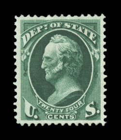 1636 ogu O65 image#O65, 24c State, an incredible quality mint single, boasting a spectacular deep prooflike color and impression on pristine paper, plus it is remarkably well centered within much larger margins than typically encountered, full o.g., lightly hinged, extremely fine; the perfect stamp for the collector taking on the challenge of assembling a gem set of officials; 1999 PF certificate and a 2004 PSE certificate (XF-Superb 95; SMQ $1,950.00). (Image) $525.00
