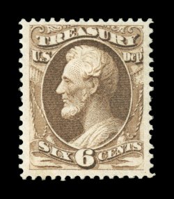 1637 ogu O75 image#O75, 6c Treasury, exceptionally well centered within especially large margins for an official stamp, lovely rich color on bright white paper, o.g., relatively lightly hinged, extremely fine; 2005 PSE certificate (XF 90; SMQ $310.00); the highest grade awarded to this stamp by the PSE. (Image) $115.00