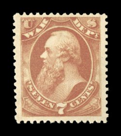 1638 ogu O87 image#O87, 7c War, exceedingly well centered within enormous margins that are rarely found on any of the official stamps, intensely rich color and a well incised impression, o.g., lightly hinged, very fine; 2005 PSE certificate (VF 80 Jumbo; SMQ $175.00 for 80 and $260.00 for 85); the highest grade the PSE has assigned to this stamp. (Image) $160.00