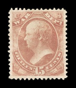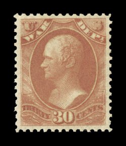 1640 ogu O92 image#O92, 30c War, outstanding centering within exceptionally large margins, rich luxuriant color and an especially sharp impression, full o.g. that has been somewhat mount disturbed, extremely fine; 2005 PSE certificate (XF-Superb 95; SMQ $550.00); the highest grade received for any Scott #O92. (Image) $125.00
