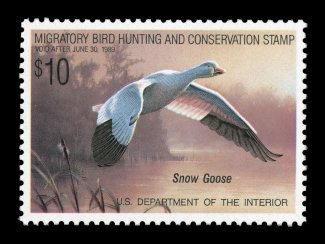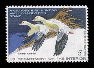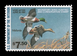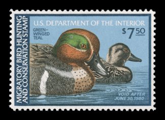 1725 nhu RW47 image#RW47, 1980 $7.50 Multicolored, the "perfect" mint single, with mathematically precise centering within very large margins, wonderfully fresh color on brilliant paper, o.g., n.h., superb; a gem for the collector assembling a set of Duck stamps in only the finest attainable quality; 2004 PSE certificate (Gem 100; SMQ $165.00 for 98, unpriced in this grade); the highest grade assigned to #RW47. (Image) $14.00