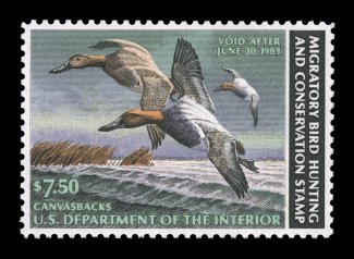 1728 nhu RW50 image#RW50, 1983 $7.50 Multicolored, another "perfect" Hunting Permit stamp, mathematically precise centering amid exceedingly large margins, bright and fresh, o.g., n.h., superb; 2004 PSE certificate (Gem 100; SMQ $155.00 for 98, not priced in this grade); the highest grade awarded to this stamp. (Image) $15.00