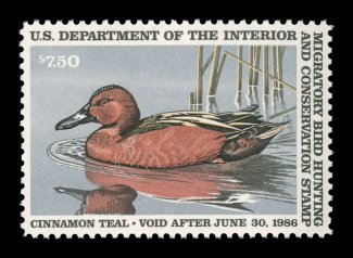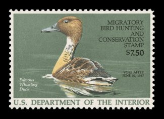 1731 nhu RW53 image#RW53, 1986 $7.50 Multicolored, extraordinarily well centered and margined, strong rich colors, o.g., n.h., extremely fine gem; 2004 PSE certificate (Superb 98; SMQ $150.00). (Image) $15.00