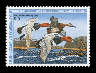1733 nhu RW55 image#RW55, 1988 $10.00 Multicolored, outstanding centering within lavishly large margins, exceedingly bright and fresh, o.g., n.h., extremely fine gem; 2004 PSE certificate (Superb 98; SMQ $160.00). (Image) $17.00