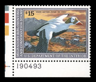 1737 nhu RW59 image#RW59, 1992 $15.00 Multicolored, bottom left corner plate no. 190493 single, marvelously well centered within extravagantly large margins, gorgeous vibrant colors on bright white paper, o.g., n.h., extremely fine; 2005 PSE certificate (XF-Superb 95; SMQ $150.00); this is the highest grade achieved to date for Scott #RW59. (Image) $27.50