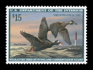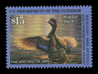 1745 nhu RW67 image#RW67, 2000 $15.00 Multicolored, perfectly centered within exceptionally large margins, "post office" fresh, o.g., n.h., superb; 2004 PSE certificate (Gem 100; SMQ $165.00 for 98, not priced as 100); one of only six stamps to be awarded this coveted grade. (Image) $25.00