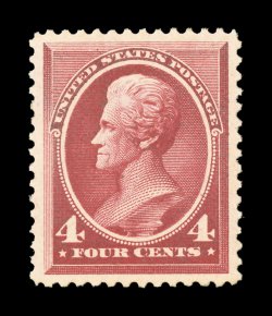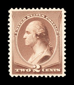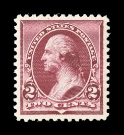 1075 nhu 219D image#219D, 2c Lake, a most extraordinary quality mint example of this scarce and difficult stamp, possessing outstanding centering within much larger margins than typically encountered, plus its color is especially deep and luxuriant on fresh paper, pristine o.g., n.h., extremely fine; among the finest #219D's we have offered in our auctions; 1985 and 2003 PF certificates, as well as a 2005 PSE certificate (XF-Superb 95; SMQ $6,500.00); this is the highest grade assigned to any never hinged 1890 Two Cent Lake. (Image) $800.00