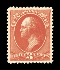 1067 ogu 214 image#214, 3c Vermilion, excellent centering within large balanced margins, especially deep vibrant color and a highly detailed impression on fresh white paper, clean o.g., very lightly hinged, extremely fine and choice; 2002 PSE certificate (XF-Superb 95; SMQ $325.00). (Image) $80.00