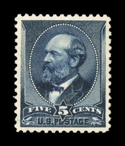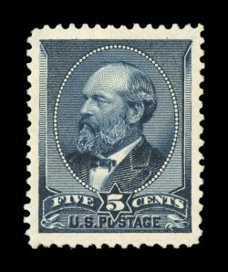 1069 ogu 216 var. image#216 var., 5c Deep blue, an eye-arresting mint single, featuring spectacular color in the deepest shade imaginable and an impression that would rival any proof, in fact all three accompanying certificates specifically classify this as the Deep blue shade, in addition the stamp is incredibly well centered within large margins, o.g., lightly hinged, a truly superb stamp; 1988 and 2003 PF certificates, as well as a 2005 PSE certificate (Superb 98; SMQ $1,900.00); not only is this the highest graded Scott #216 in the PSE population report, it is also the sole example to have been awarded this remarkable grade; ex-Beckley. (Image) $275.00