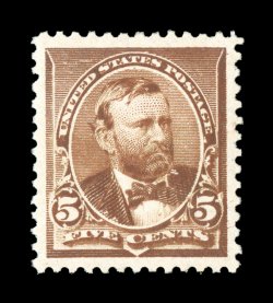 1078 ogu 223 image#223, 5c Chocolate, a highly desirable mint example, with lavishly large and perfectly balanced margins all around, lovely rich color and a well incised impression on pristine white paper, o.g., very lightly hinged, extremely fine gem; 2005 PSE certificate (XF-Superb 95; SMQ $390.00); only one stamp grades higher (95J). (Image) $100.00