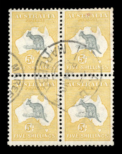 242 Obl 42 image#42, 5/- Grey and chrome, very scarce postally used block of four, outstanding centering, neat central strike of a "Paid/Mareeba/4.NO.14" double circle postmark, paper wrinkles and the top right stamp with diagonal crease, small flaws consistent with having been used on a parcel, very fine appearance; postally used blocks of the high values are seldom encountered (for four used singles A$800+). (Image) Est. 400-500
