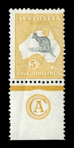 244 og 42za image#42za, 5/- Grey and chrome, the renowned CA monogram mint single, easily qualifying as one of the most important rarities in all Australian philately, as any CA monogram piece on the 5/- First Watermark is of the utmost rarity, with only four having been recorded, of which this is the only mint example, the others being a c.t.o strip of three in the Royal Collection, a c.t.o. block of four (see next lot) and a single, brilliantly fresh, radiant colors, o.g., lightly hinged, vertical gum crease which is of no significance given this monogram singles unique status, fine (A$27,500 - we are certain the final realization this stamp achieves in the Gray sale will completely revise this seemingly low catalog value). (Image) Est. 30,000-40,000