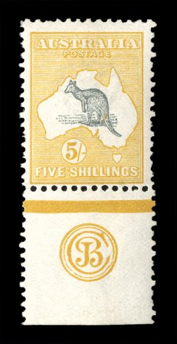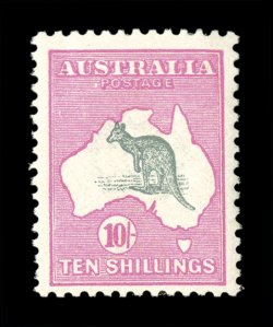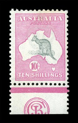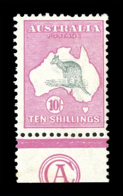 258 og 47za image#47za, 10/- Grey and pink, an extraordinary JBC monogram single, particularly bright and fresh, well centered, o.g., lightly hinged, very fine.JBC monogram pieces on the 10/- First Watermark issue are equally as rare and desirable as the CA monogram. There are only six recorded in any form - a mint pair, four mint singles (one of which is in the R.T.P. Chapman collection, now part of the Australia Post archival collection) and a single handstamped "Specimen" (see next lot). All have the monogram incomplete by being trimmed at the base.The last recorded auction realization for a JBC monogram single, was the similarly centered (but bit hinge reinforced) copy offered in the May 2002 sale of Kevin Nelson's Gold Medal collection of Australian Kangaroos (Prestige Philately). It realized a then record A$36,000, plus the 12% buyer's premium, which established the A$40,000 catalog value in 2004. (Image) Est. 30,000-40,000