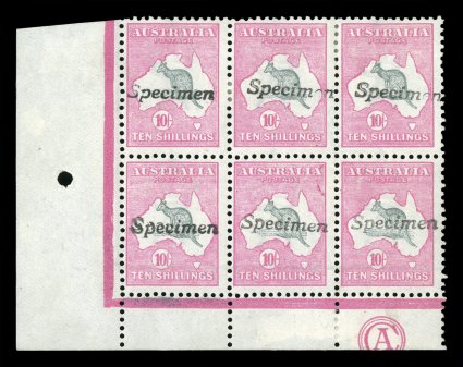 255 Sbl 47xa image#47xa, 10/- Grey and Pink, handstamped "Specimen", an extraordinarily rare and handsome left sheet-margin block of four, with the top right stamp showing a most unusual "Soecimen" for "Specimen" spelling error (resulting from a broken "P" font), well centered, rich colors, without gum, very fine; any high value (10/-, £1, £2) multiple with "Specimen" handstamps are rare, with this block being one of only four recorded; ex-Holbeach (A$4,000+). (Image) Est. 3,000-4,000