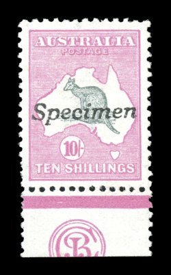 259 S 47x/za image#47x/za, 10/- Grey and pink, handstamped "Specimen", gem JBC monogram single, uniformly large and well balanced margins, fresh rich colors, o.g., minor h.r., extremely fine.Of the mere six recorded 10/- First Watermark issue JBC monogram pieces, this is the only "Specimen" example.An important world-class rarity for the finest collection and/or exhibit of Australian Kangaroo stamps (A$40,000). (Image) Est. 30,000-40,000