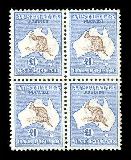 266 og/nhbl 51 image#51, £1 Brown and blue, an an extraordinarily rare mint block of four, each stamp being marvelously well centered and margined, deep rich colors on particularly fresh paper, pristine o.g., two left stamps n.h., both right stamps with small paper strips in right margin to enhance some shorter perforations, bottom right stamp with sealed tear, nonetheless this is the finest appearing of only four recorded blocks of four (for two n.h. and two hinged singles A$23,000+). (Image) Est. 10,000-15,000