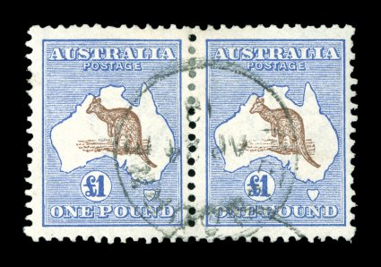 267 O 51w image#51w, £1 Brown and blue, horizontal pair, with central "Melbourne/AP.24.13" c.t.o., well centered within large margins, deep rich colors, part o.g., very fine; cancelled-to-order high values are quite scarce, as most were instead handstamped "Specimen" to accommodate collector sets, and any multiples are extremely rare, in fact this being the only recorded multiple (for two singles A$5,000). (Image) Est. 3,000-4,000