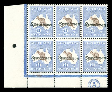 269 Sbl 51x image#51x, £1 Brown and blue, handstamped "Specimen", a remarkable top left corner margin block of four, each stamp with "Specimen" handstamp, except the top left stamp with double "Specimen" handstamp, one being inverted, well centered, few hinge reinforced separated perforations at right of horizontal row, without gum, very fine and handsome; this is the unique listing example of the double "Specimen" overprint, one inverted; ex-Holbeach (A$15,000). (Image) Est. 7,500-10,000