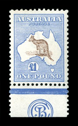 272 og 51zb image#51zb, £1 Brown and blue, pristine JBC monogram single, prooflike colors and impressions on bright paper, well centered, o.g., minor h.r., very fine and exceptionally choice.Like the CA monograms on the £1 First Watermark, JBC monogram pieces are extremely rare. However, of the six recorded examples in any form, only two are mint singles and available to collectors. The other recorded pieces are a strip of three in the Royal Collection, as well as three with "Specimen" handstamps (a strip of three, a pair - see next lot - and a single).The mint monogram single offered here is one of the highlights of the Gray Collection and is considered among the greatest and most sought after rarities in Australian philately (A$50,000). (Image) Est. 40,000-50,000