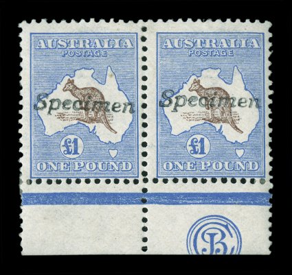 273 S 51x/zb image#51x/zb, £1 Brown and blue, handstamped "Specimen", bottom margin JBC monogram pair, rich colors, o.g., small hinge reinforcement between stamps and selvage, fine; of the only six recorded £1 First Watermark issue JBC monogram pieces, three are found in various forms with "Specimen" handstamps, a strip of three, the pair offered here and a single; an extraordinary rarity of the First Watermark issue (A$17,500). (Image) Est. 10,000-15,000