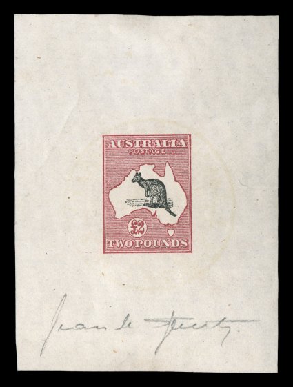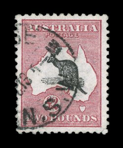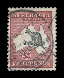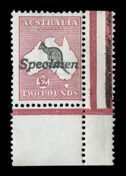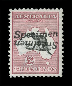 284 S 55xb image#55xb, £2 Black and rose, double handstamp "Specimen", one inverted, well centered, fresh, o.g., minor h.r., very fine; an extremely rare "Specimen" error, being one of only two recorded, this being the example illustrated on page 2/129 in the Australian Commonwealth Specialists' Catalogue (A$10,000). (Image) Est. 7,500-10,000