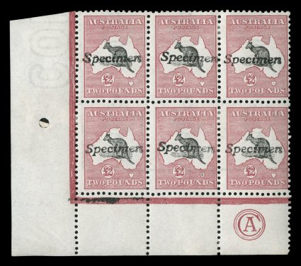 286 Sbl 55x/z image#55x/z, £2 Black and rose, handstamped "Specimen", bottom left corner margin CA monogram block of six, rich luxuriant colors, centered just a bit to right, o.g., fine and striking.This extraordinary multiple is the only monogram block of six - the most highly prized configuration for monogram collectors - known for either the CA or JBC monogram. Of the CA monogram pieces there are only a total of six recorded, this block, a block of four and a single all with "Specimen" handstamps, plus three mint singles, one of which is housed in the Australia Post archival collection.A spectacular showpiece monogram multiple for the finest collection (A$60,000). (Image) Est. 40,000-50,000