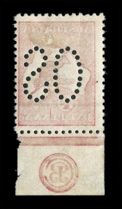 294 nh 2ba/cb image#2ba/cb, 1p Red, Die I, large "OS", offset, choice mint single showing characteristic light offset, o.g., n.h., fresh and fine; the most prominent offsets found on the 1p First Watermark are typically on stamps punctured large "OS" (for hinged A$400). (Image) Est. 150-200