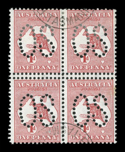 296 Obl 3ba/b image#3ba/b, 1p Red, Die II, large "OS", double perforation, most unusual used block of four, bottom pair with double horizontal perforations at top and sides where they are virtually coincident with the original perforations, neat Tasmania c.t.o. postmarks, full o.g., top pair with h.r., fine. (Image) Est. 300-400