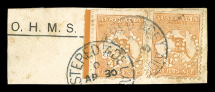 298 O 15ba var. image15ba var., 4p Orange, large "OS", punctures inverted, two singles (both with small pieces of stamps missing) tied to small piece with "O.H.M.S." imprint by two strikes of "Adelaide/Ap 30/15/Registered" c.d.s., some light foxing and piece folded between stamps, inverted "OS" punctures, particularly used, are seldom encountered. (Image) Est. 300-400