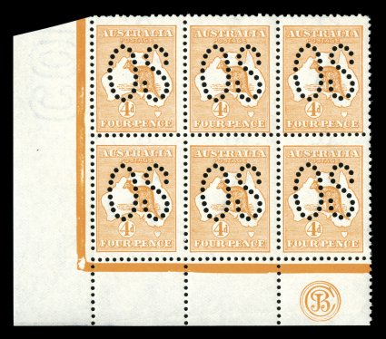 299 nhbl 15ba/z image#15ba/z, 4p Orange, large "OS", an exceedingly handsome and rare bottom left corner margin JBC monogram block of six from Plate 2, sumptuously rich color on fresh paper, nicely centered, pristine o.g., n.h., lightly folded along bottom row of horizontal perforations, light horizontal crease in extreme bottom of sheet selvage, overall fine-very fine; JBC monogram pieces of this value are extremely rare, and especially so punctured "OS" (for hinged monogram strip of three and three n.h. singles A$10,875+). (Image) Est. 5,000-7,500